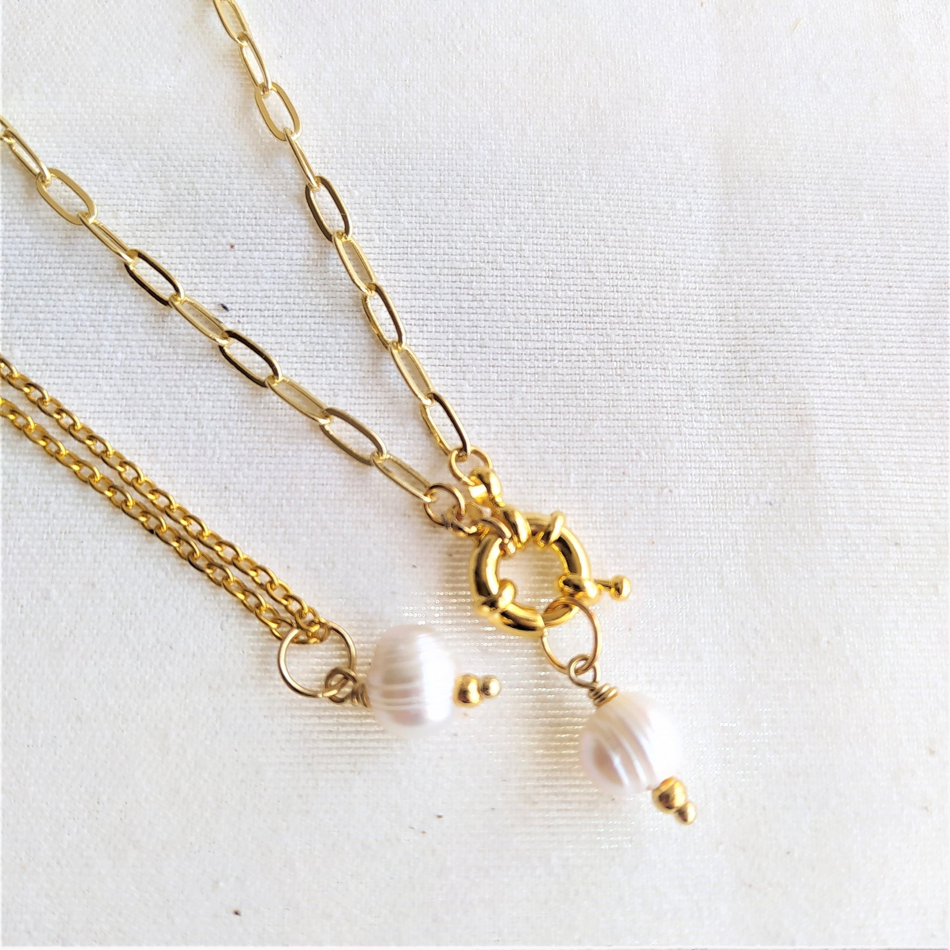 Charm de perla fabricado a mano con bastón de acero bañado en oro y cuentas de latón con baño de oro. Tamaño aproximado 10mm. Trae una anilla de 6mm de diámetro para que puedes pasarlo por la cadena que elijas o colgarlo de unos de los cierres de los collares de cuentas. Puedes tener un solo collar y hacerlo diferente usando uno o varios charms diferentes. Un collar, varios estilos!