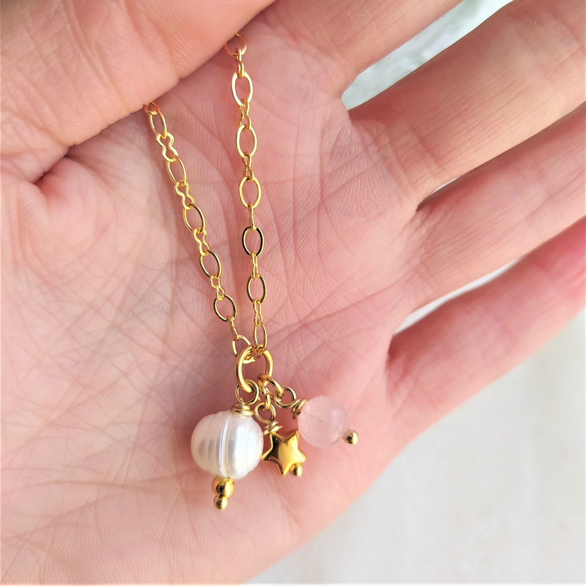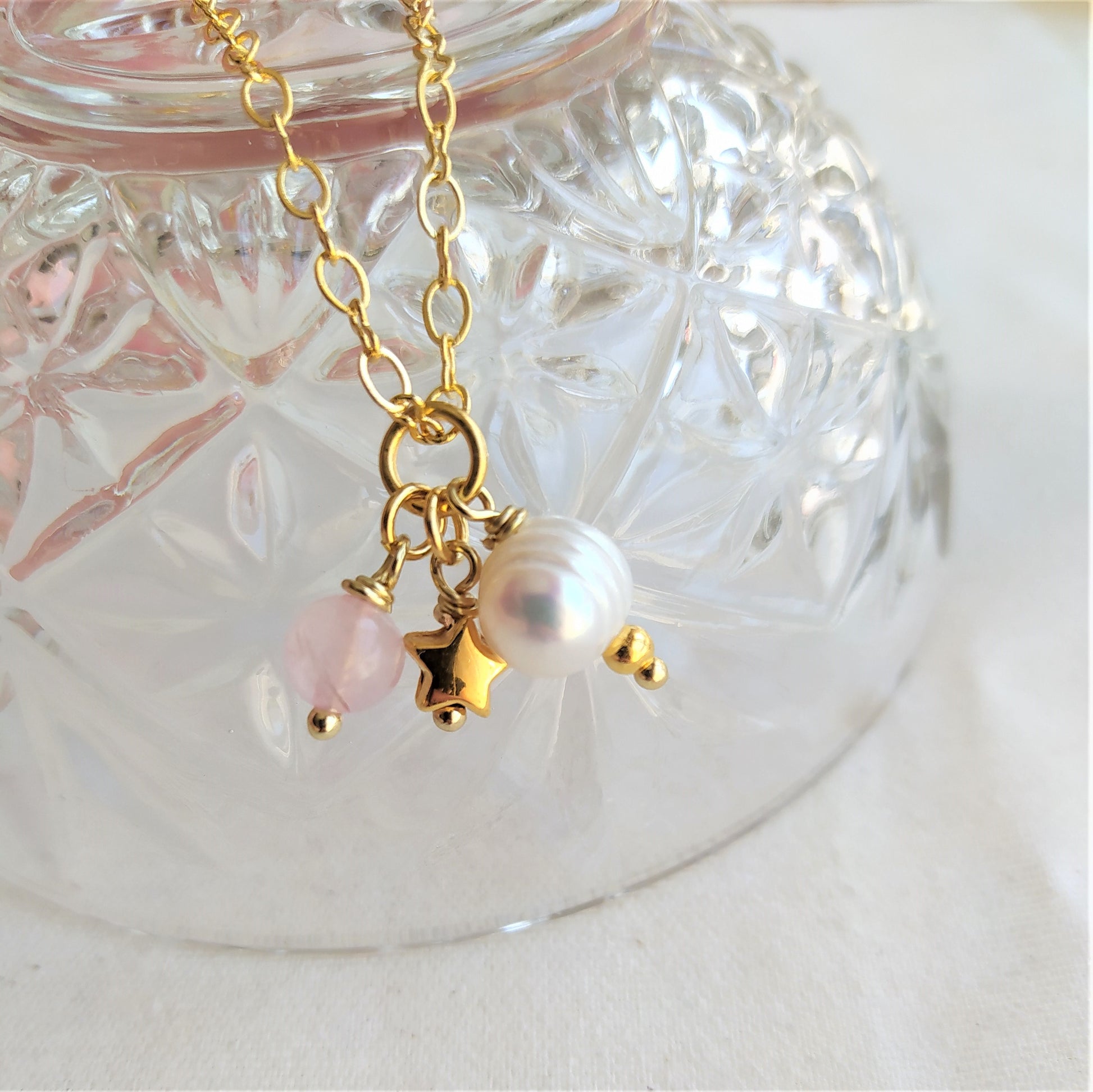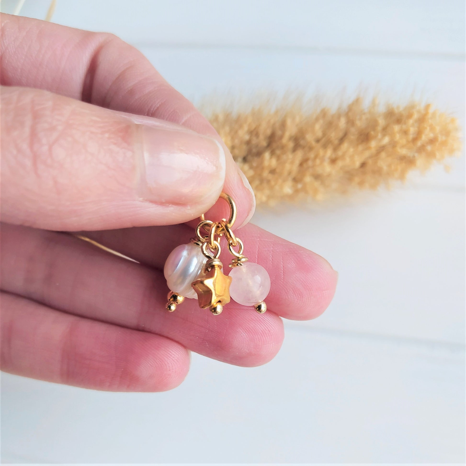 Charm con colgantes fabricado con perla cultivada 10mm, cuenta de Cuarzo Rosa de 6mm y estrellita de zamak bañada en oro. La perla y la cuenta están montadas a mano con bastón de acero bañado en oro y cuentas de latón con baño de oro. La estrellita mide 5mm. Trae una anilla de 6mm de diámetro para que puedes pasarlo por la cadena que elijas o colgarlo de unos de los cierres de los collares de cuentas. Puedes tener un solo collar y hacerlo diferente usando uno o varios charms diferentes. Un collar, varios estilos!