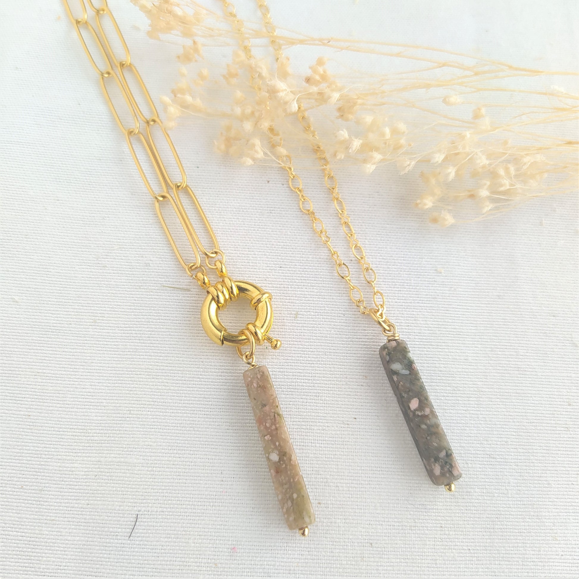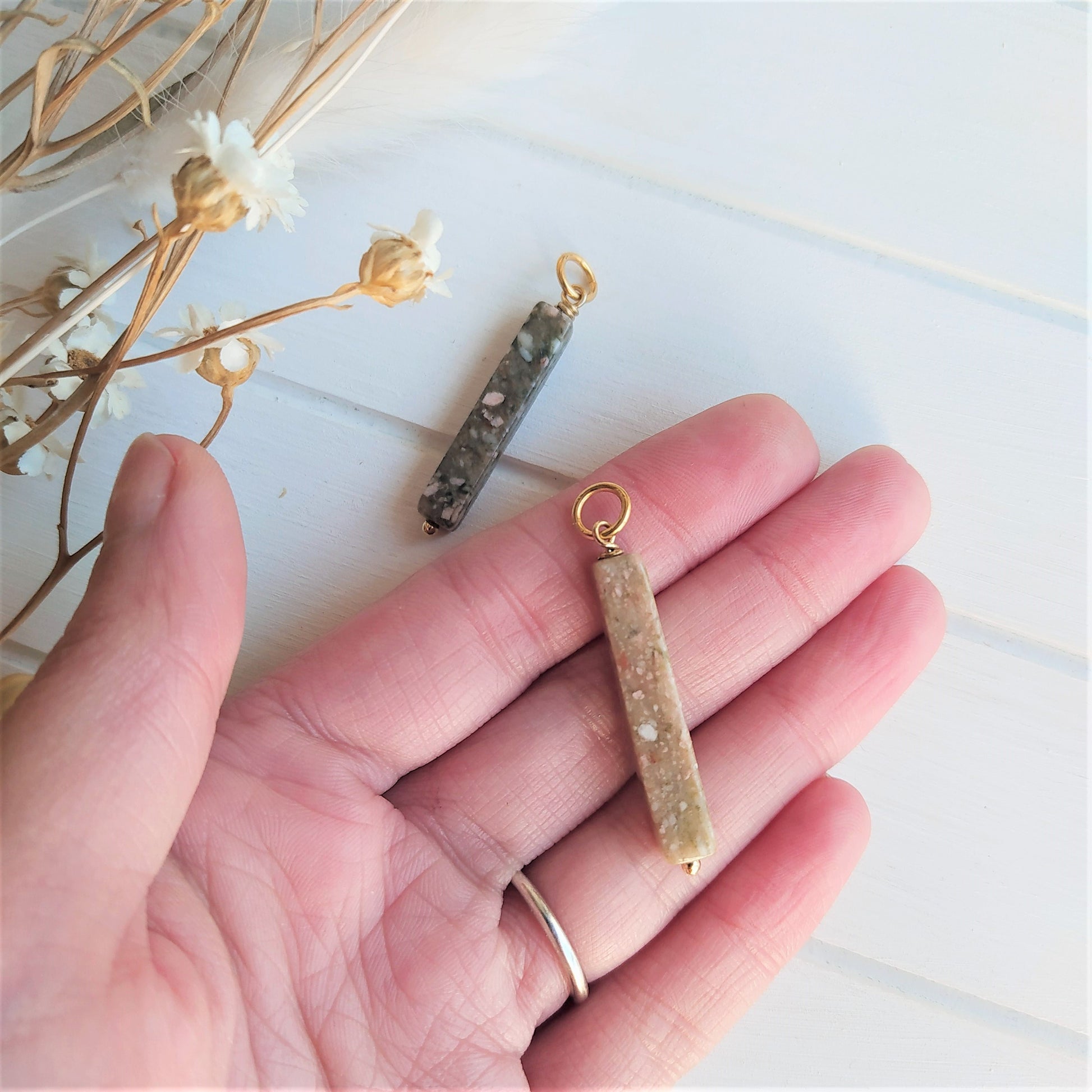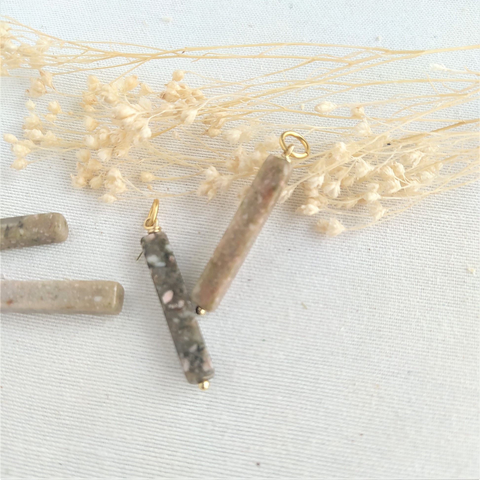 Charm elaborado con una pieza de Unakita en forma de rectángulo de 5x30mm, montada a mano sobre bastón de acero con tope de bola. Trae una anilla de 6mm de diámetro para que puedes pasarlo por la cadena que elijas o colgarlo de unos de los cierres de los collares de cuentas. Puedes tener un solo collar y hacerlo diferente usando uno o varios charms diferentes. Un collar, varios estilos!