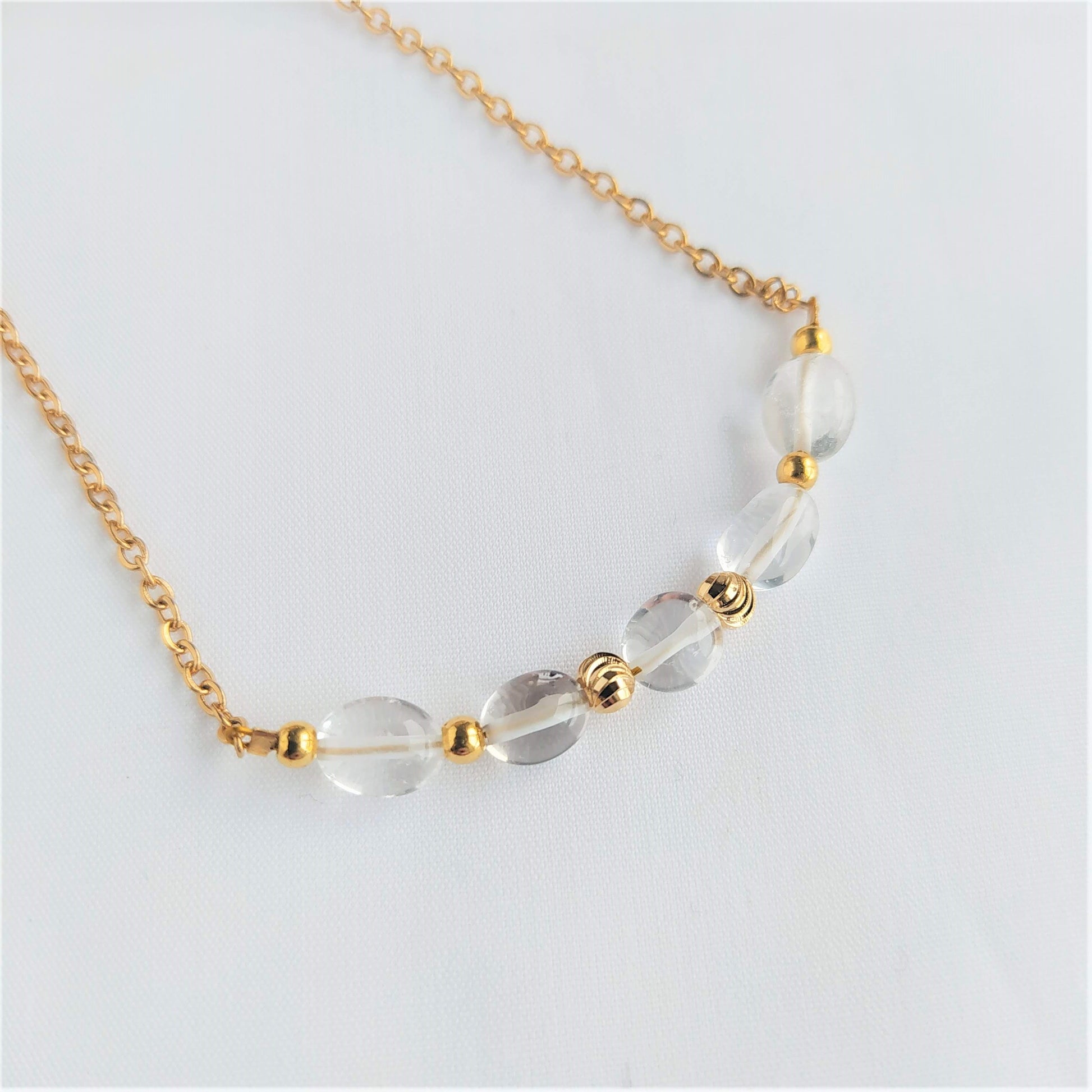 Se trata de un collar fabricado con cadena de acero bañado en oro y piedras naturales afines con cada mes de nacimiento. Al mes de Abril le corresponde el Cuarzo Cristal. En este caso lleva cuentas de Cuarzo Cristal en diferentes tamaños. El largo del collar es de 39cm ampliables hasta 44cm.
