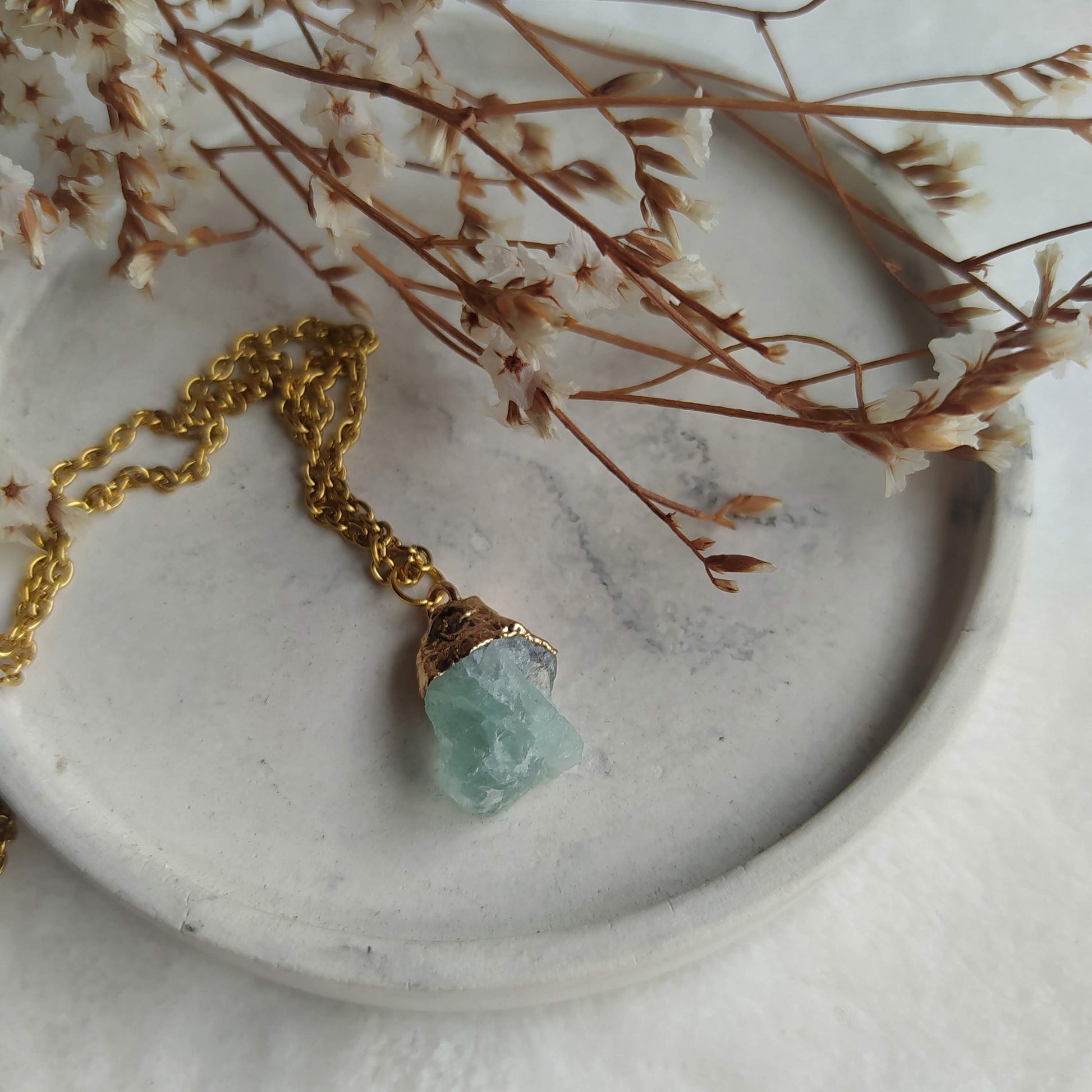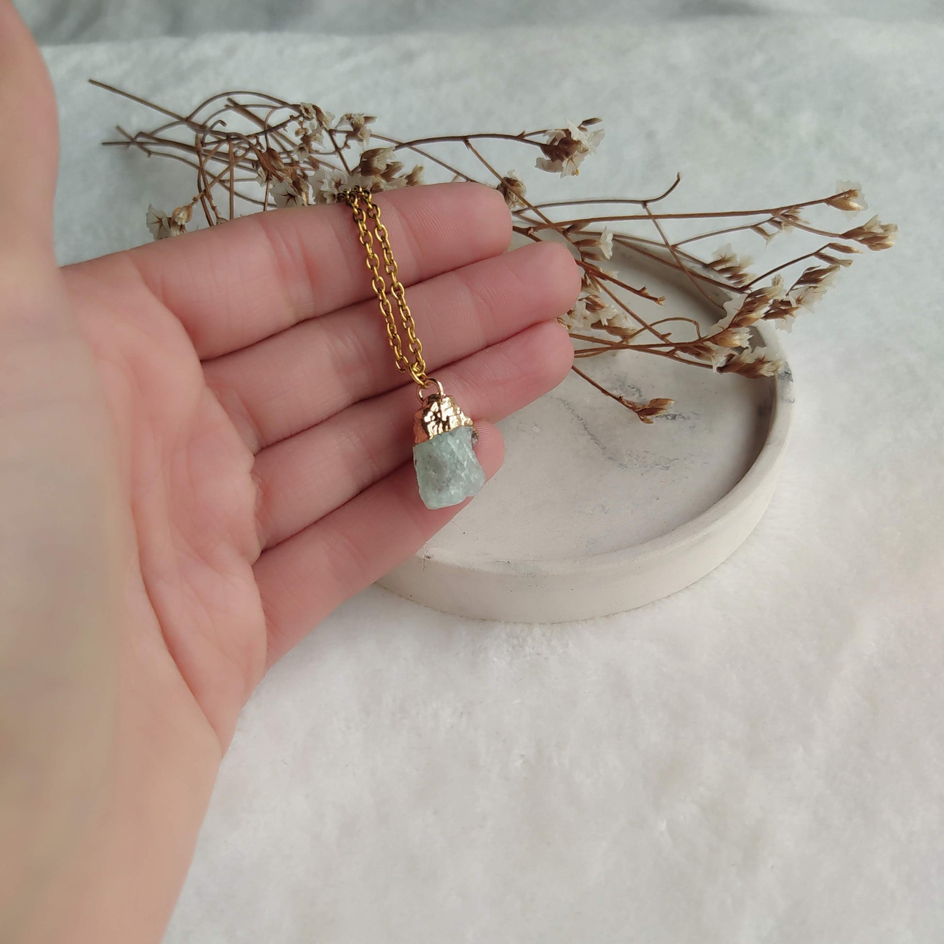 En este collar encuentras un trocito de este maravilloso mineral sin pulir, con una base con baño de oro y cadena de acero bañada en oro. Tiene un largo aproximado de 40cm y un expansor de 5cm que le da un largo total de 45cm. En las fotos donde te lo muestro puesto, puedes ver cómo queda a 40cm y a 45cm.