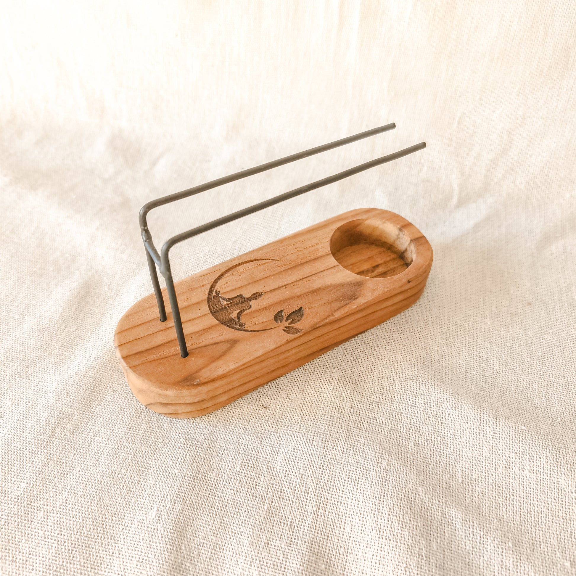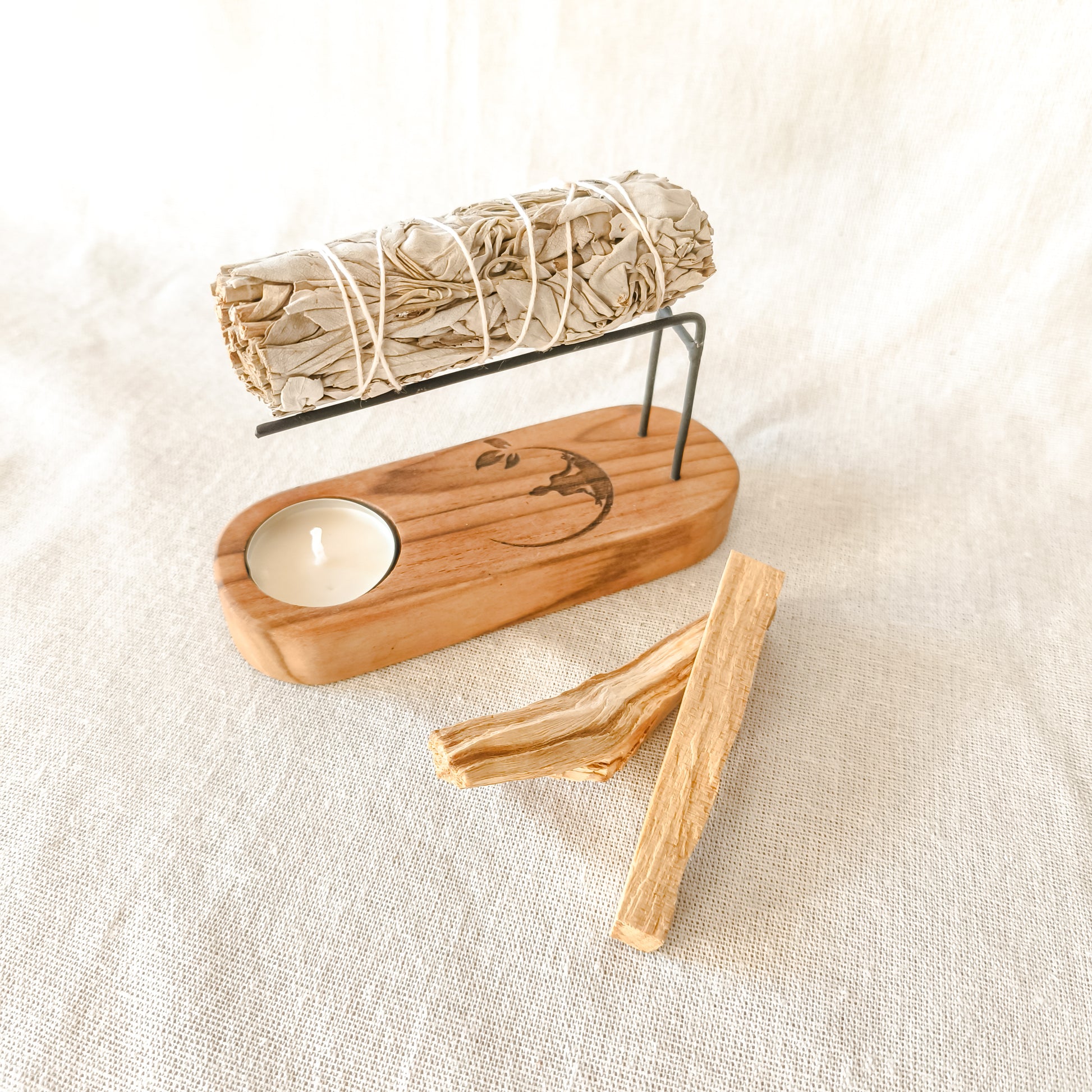 Enciende una vela de té en la base, coloca un bastón de Palo Santo encendido sobre el soporte y disfruta de un sahúmo prolongado.