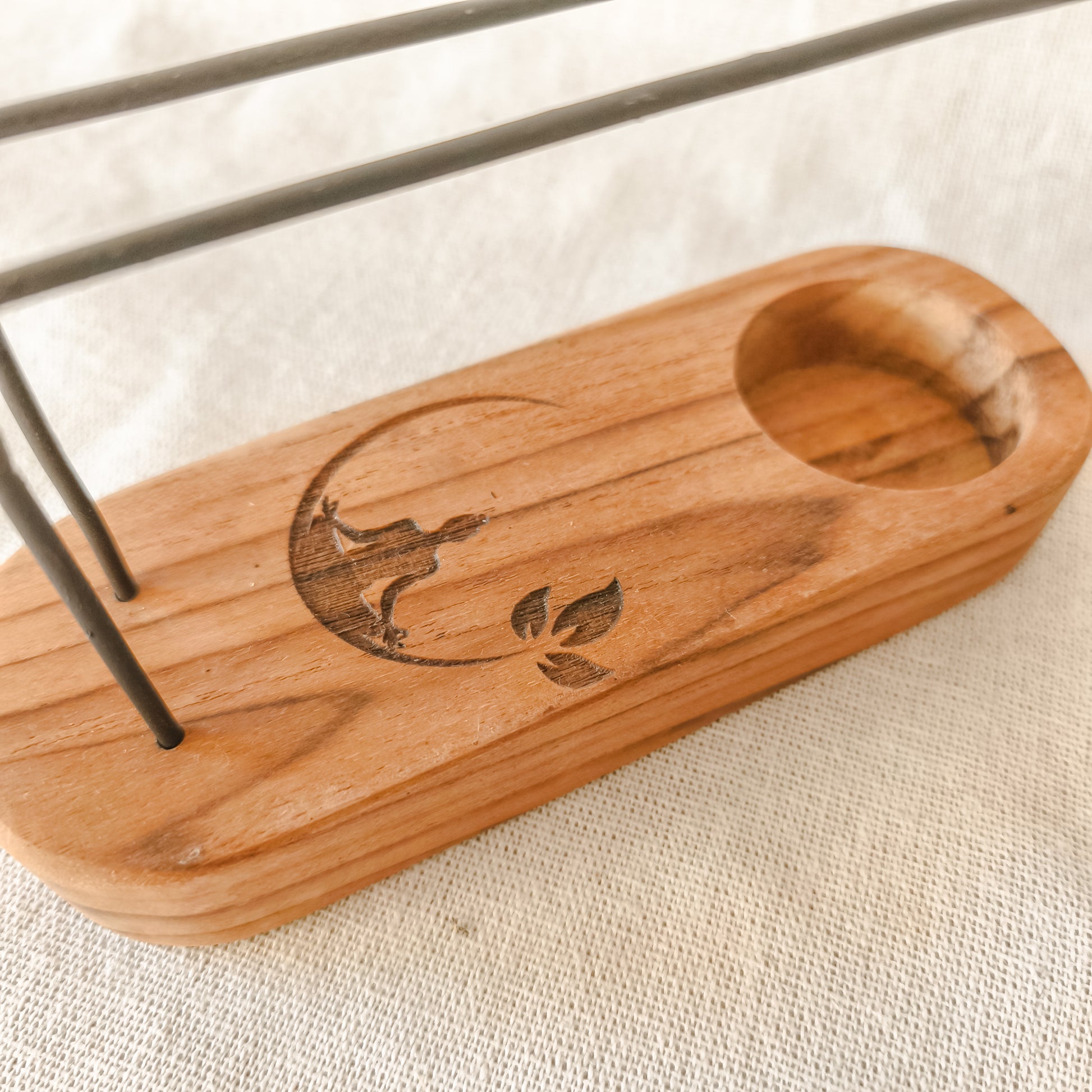 Está fabricado en madera de teca y metal, las varillas elevadas permiten que la varita o el atado esté cerquita de la llama sin llegar a tocarlo. Lleva grabada una imagen de buda.
