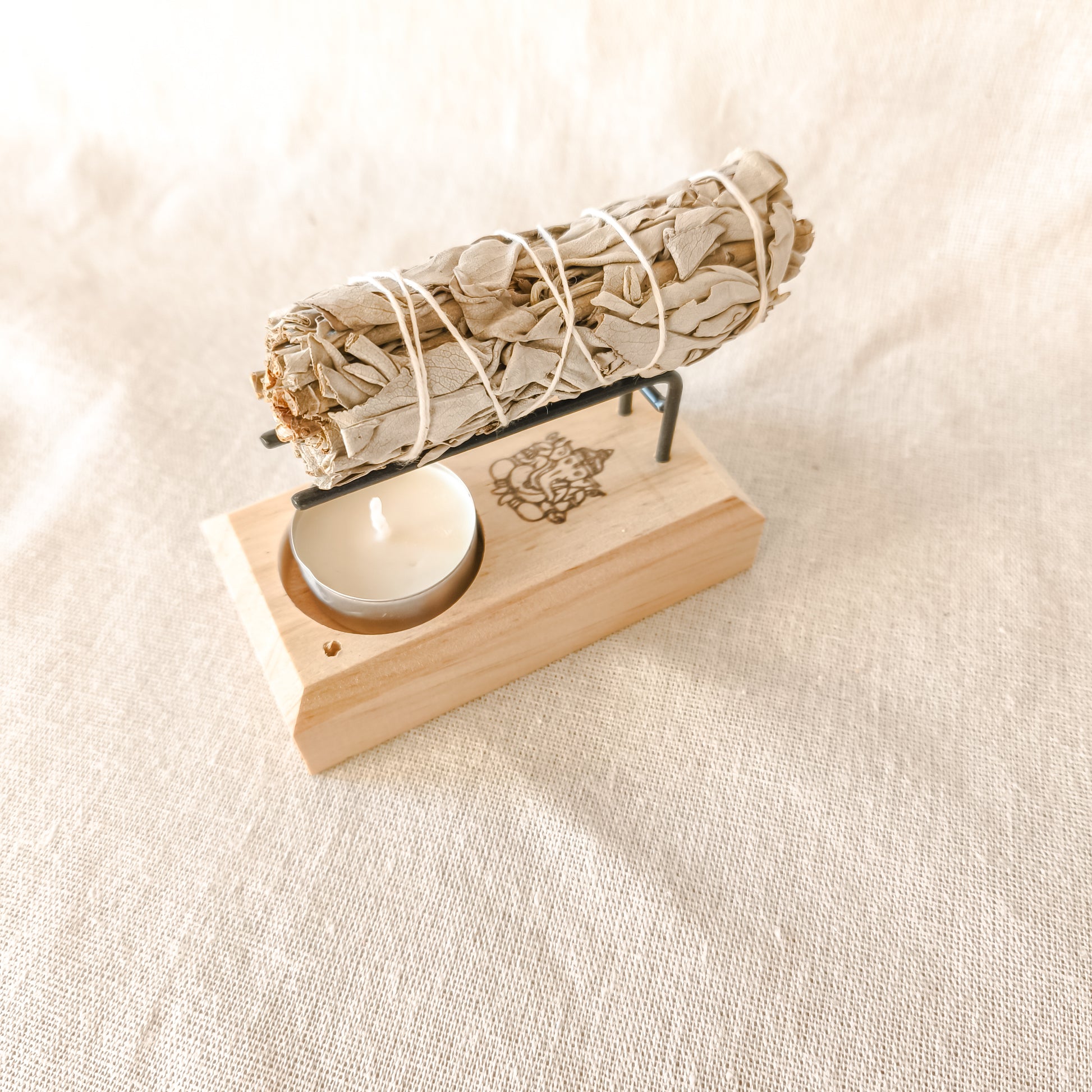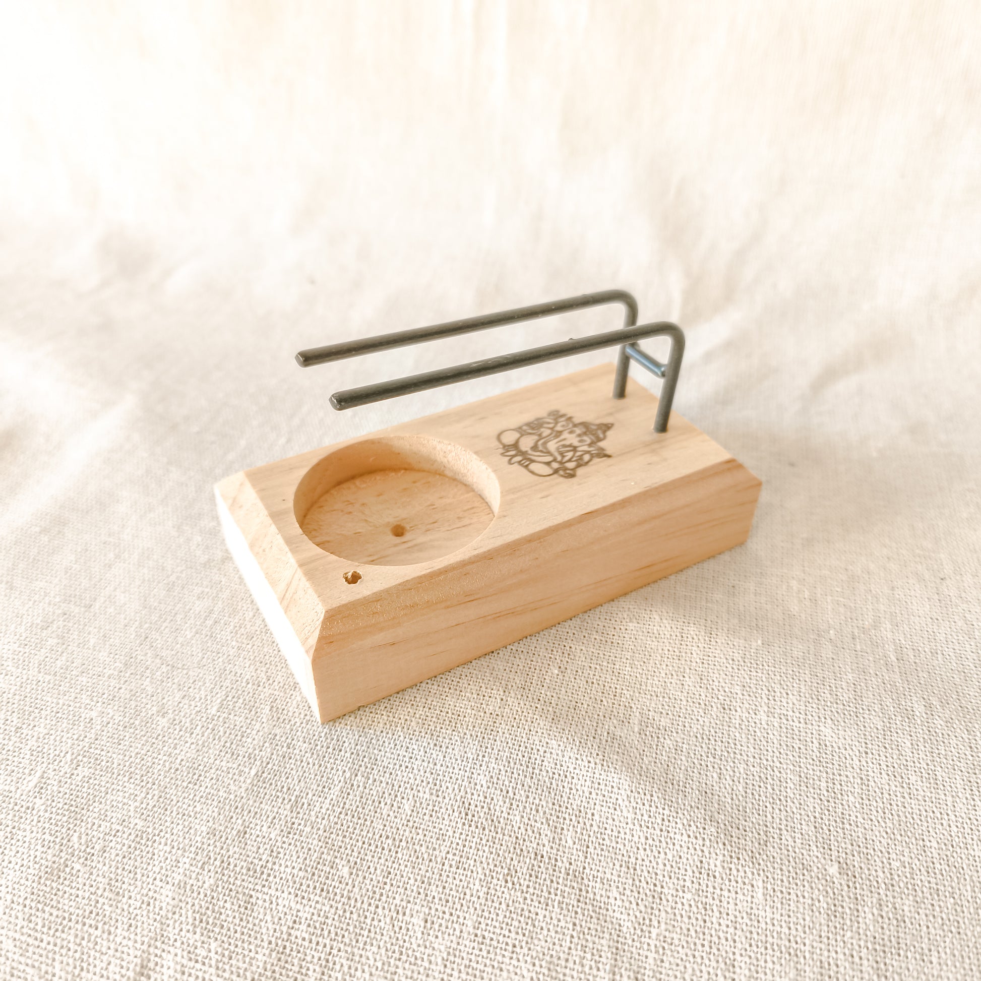 Está fabricado en madera de pino y metal, las varillas elevadas permiten que la varita o el atado esté cerquita de la llama sin llegar a tocarlo. Lleva grabada una imagen de Ganesh.