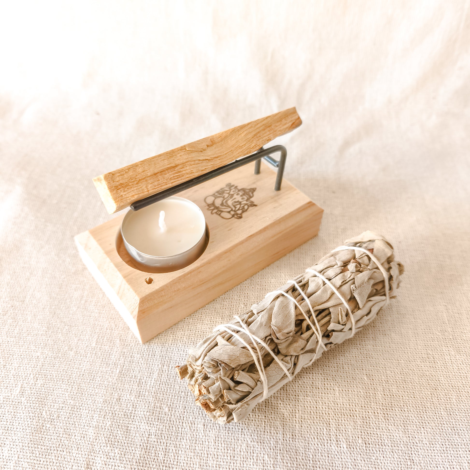 Enciende una vela de té en la base, coloca un bastón de Palo Santo encendido sobre el soporte y disfruta de un sahúmo prolongado.