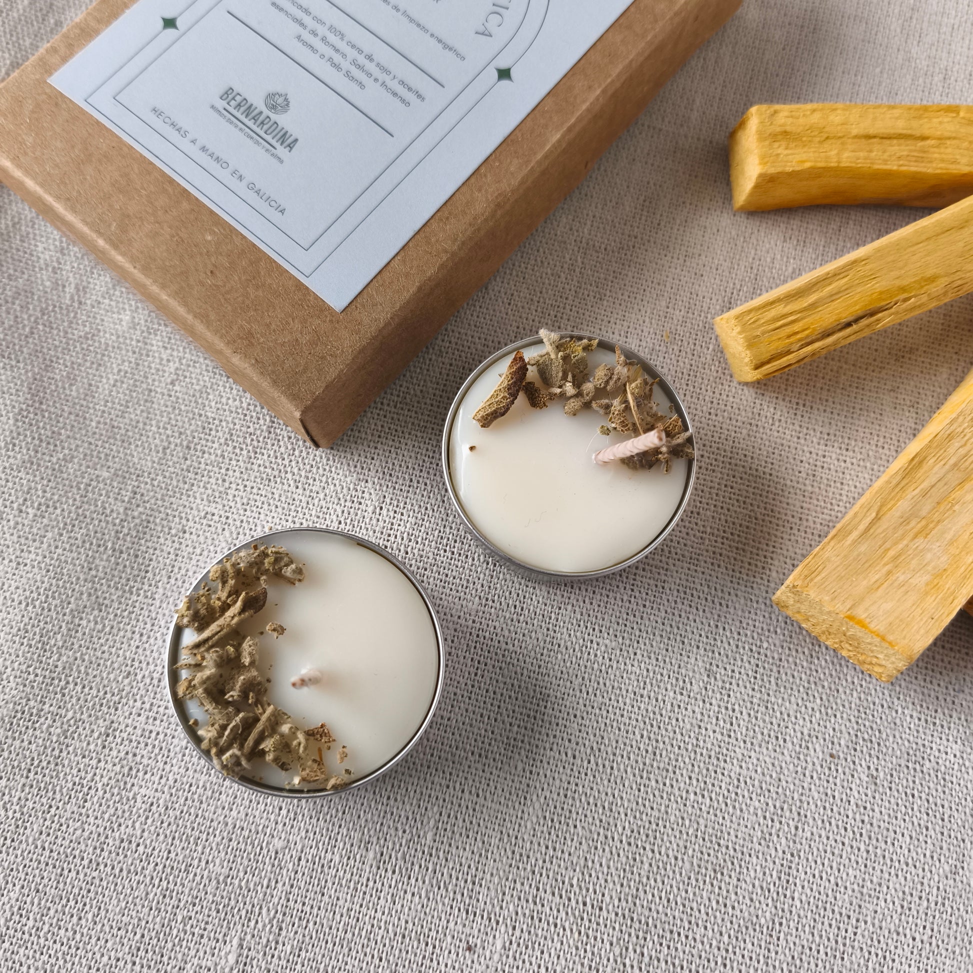 Vela de té de 15gr y 4cm de diámetro. Tiempo de quemado: 4 horas aproximadamente. Fabricada con 100% cera de soja, vegetal, natural, sin parafinas y biodegradables. No testado en animales. Fabricación artesanal. Decorada con hojas de Salvia Blanca. Aceites esenciales de Romero e Incienso, puros y de alta calidad. Fragancia aromática que cumple con la normativa IFRA, sin ftalatos.
