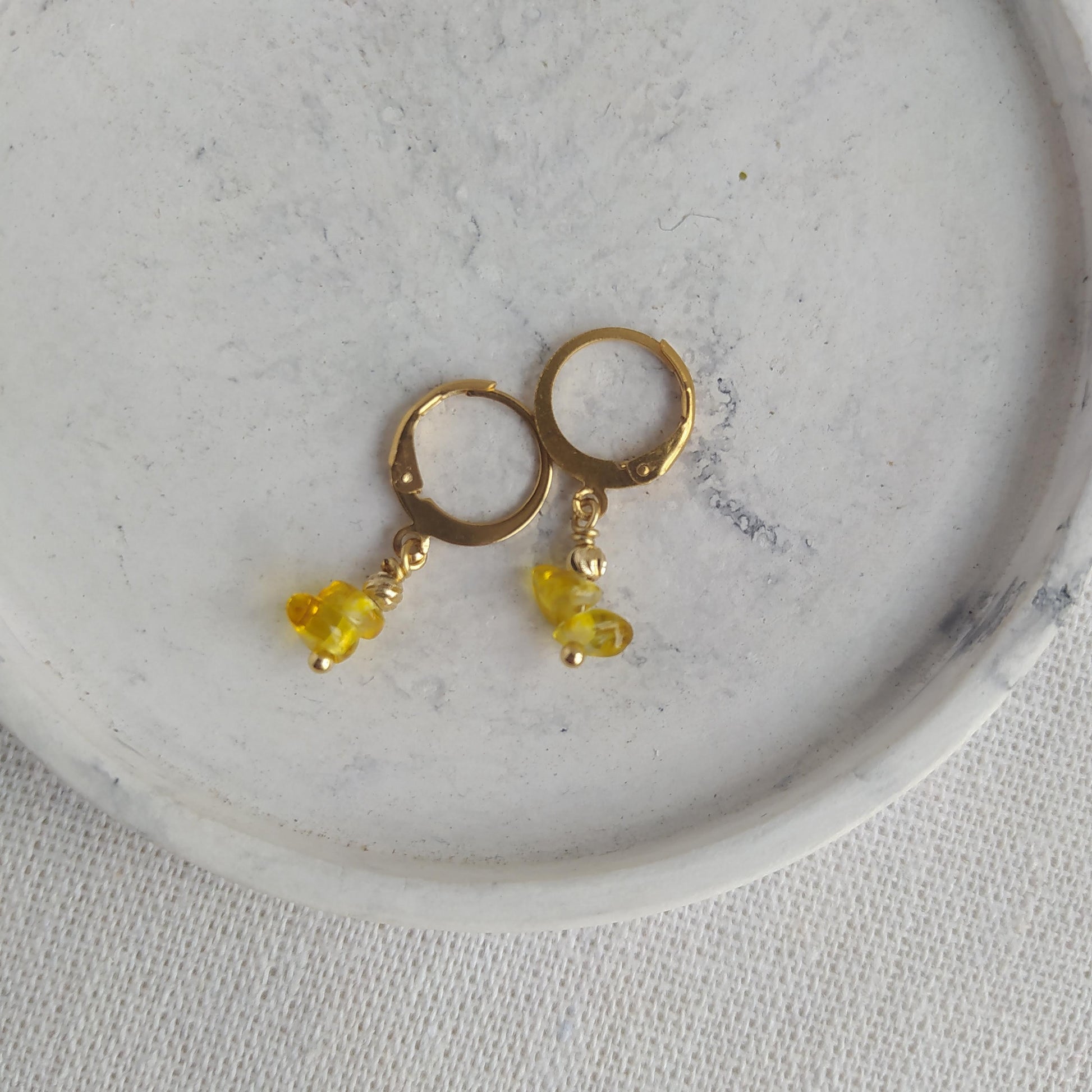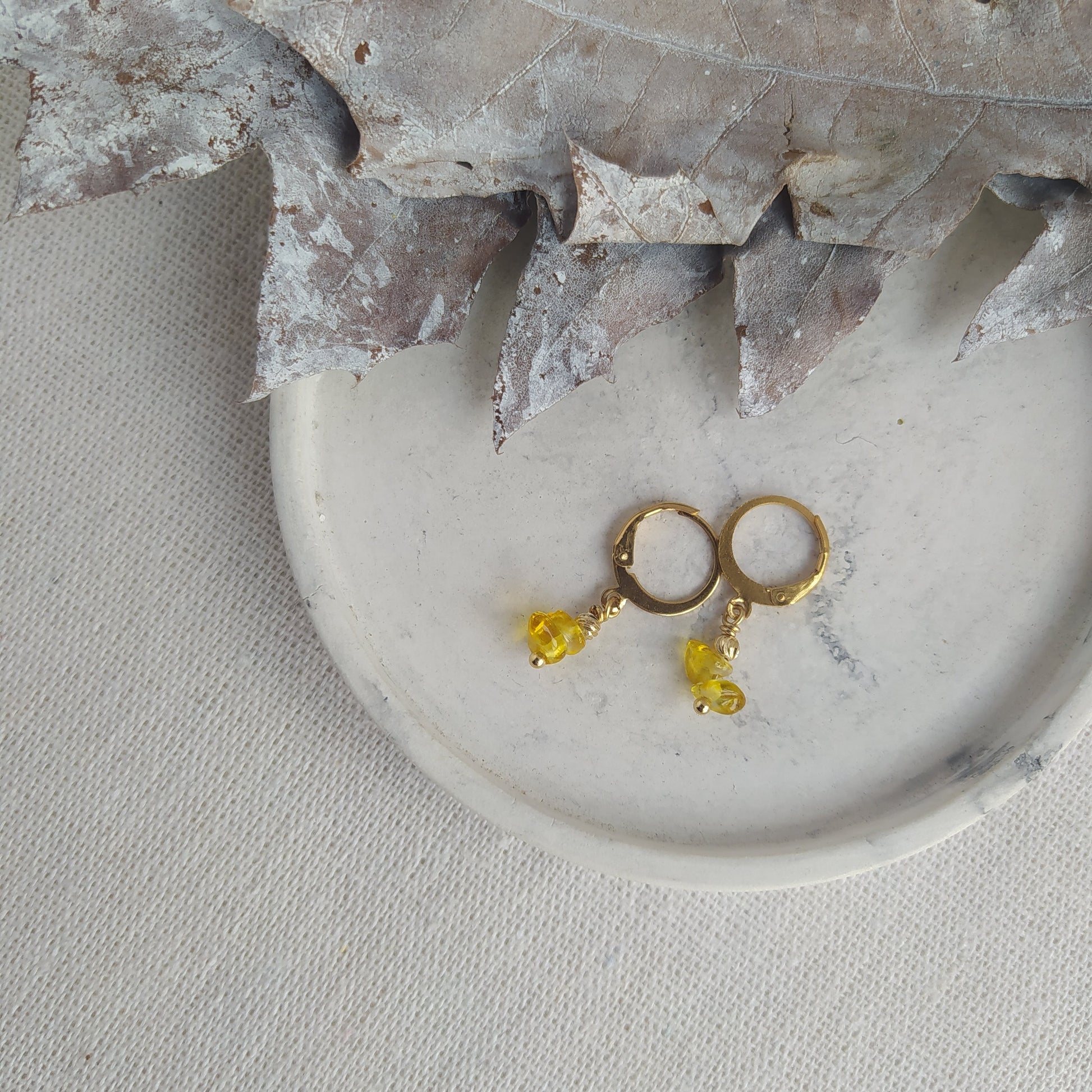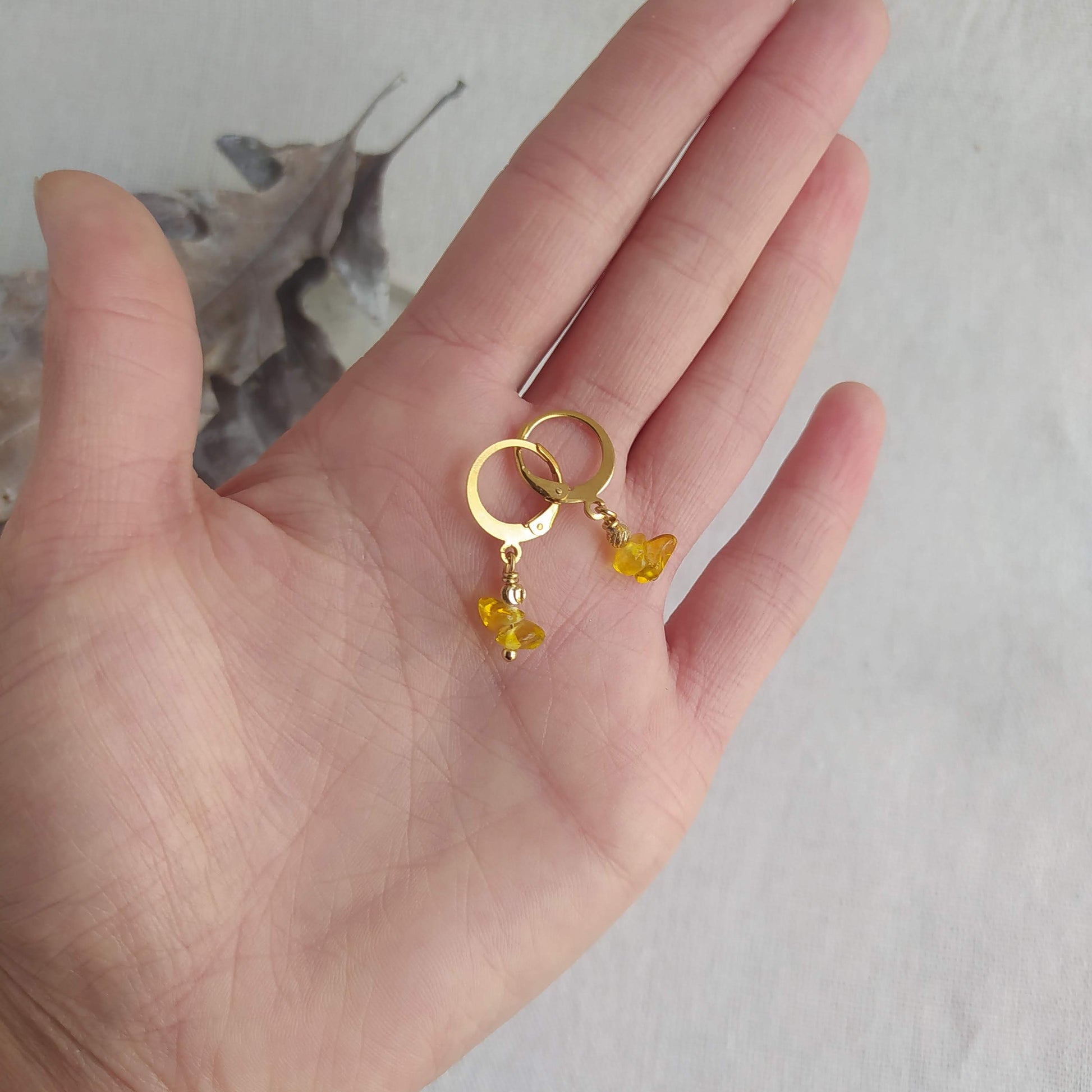 Lleva contigo tu piedra del mes o la de quien tu quieras con estos aritos fabricados artesanalmente, de acero bañado en oro y una piedra naturales afines al mes de enero, el Citrino. Además lleva cuentas de latón bañado en oro 24k. El largo aproximado total es de 1,8cm. El diámetro interior del aro es de 9mm aproximadamente.