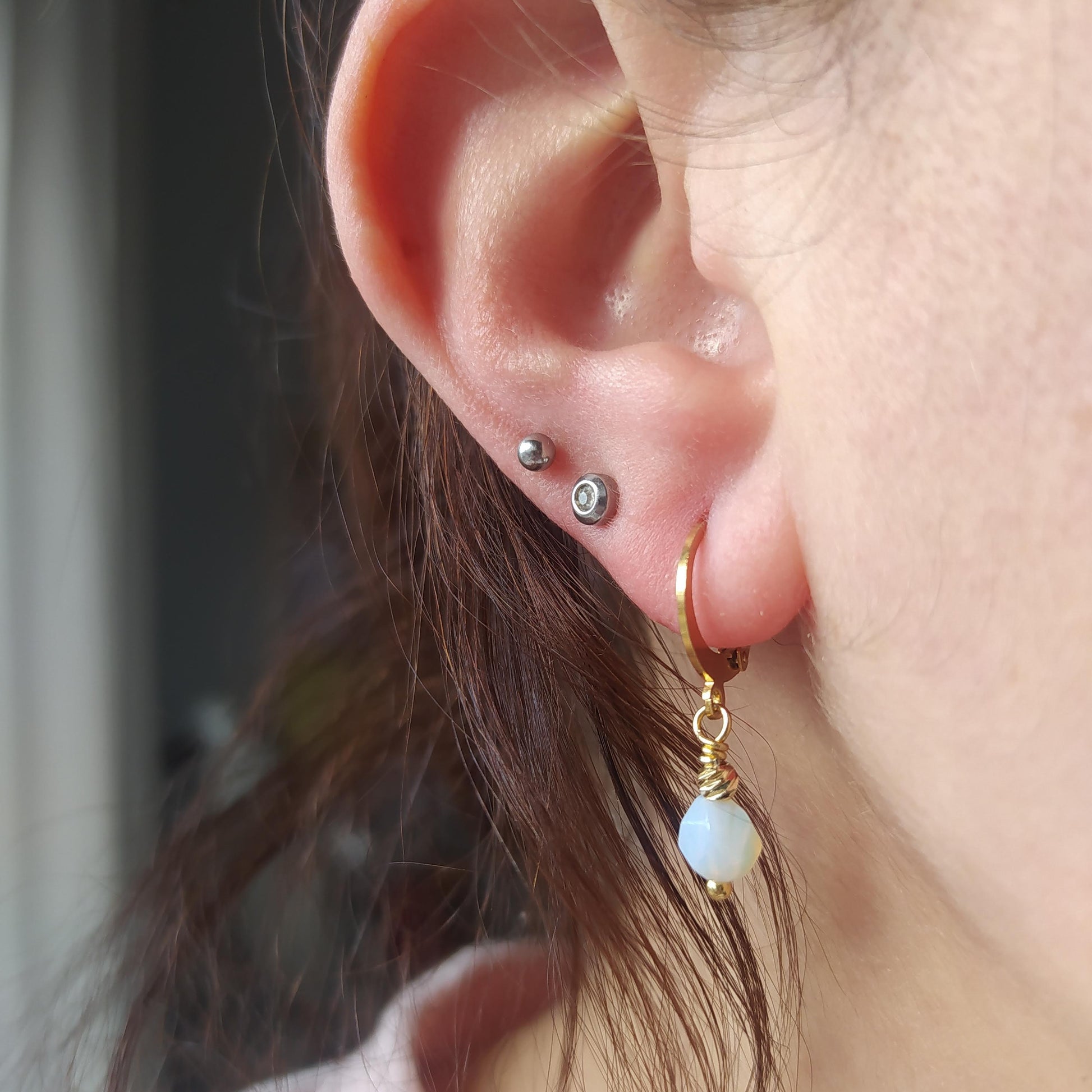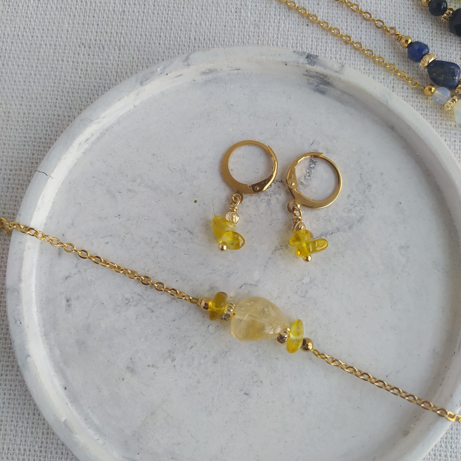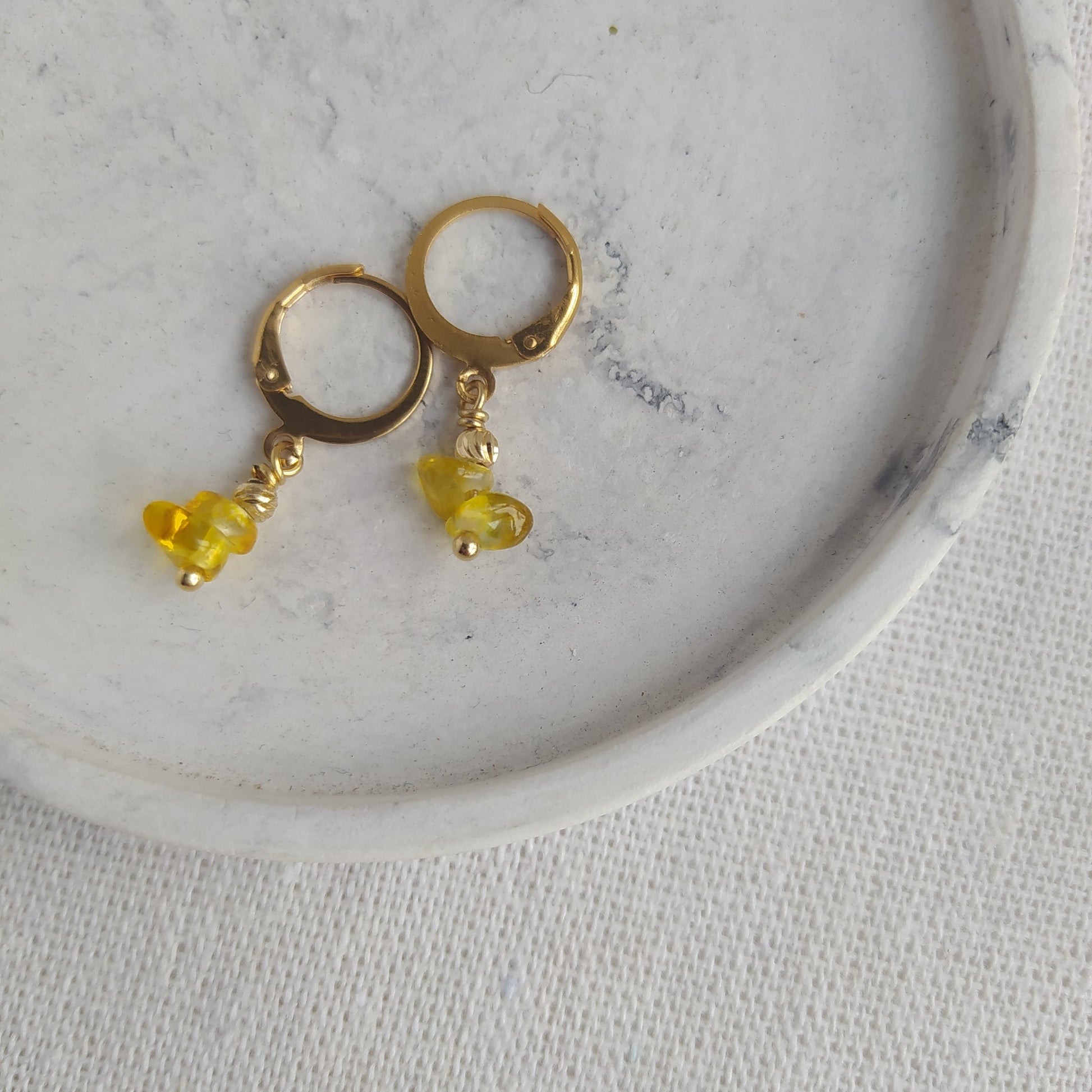 Lleva contigo tu piedra del mes o la de quien tu quieras con estos aritos fabricados artesanalmente, de acero bañado en oro y una piedra naturales afines al mes de enero, el Citrino. Además lleva cuentas de latón bañado en oro 24k. El largo aproximado total es de 1,8cm. El diámetro interior del aro es de 9mm aproximadamente.