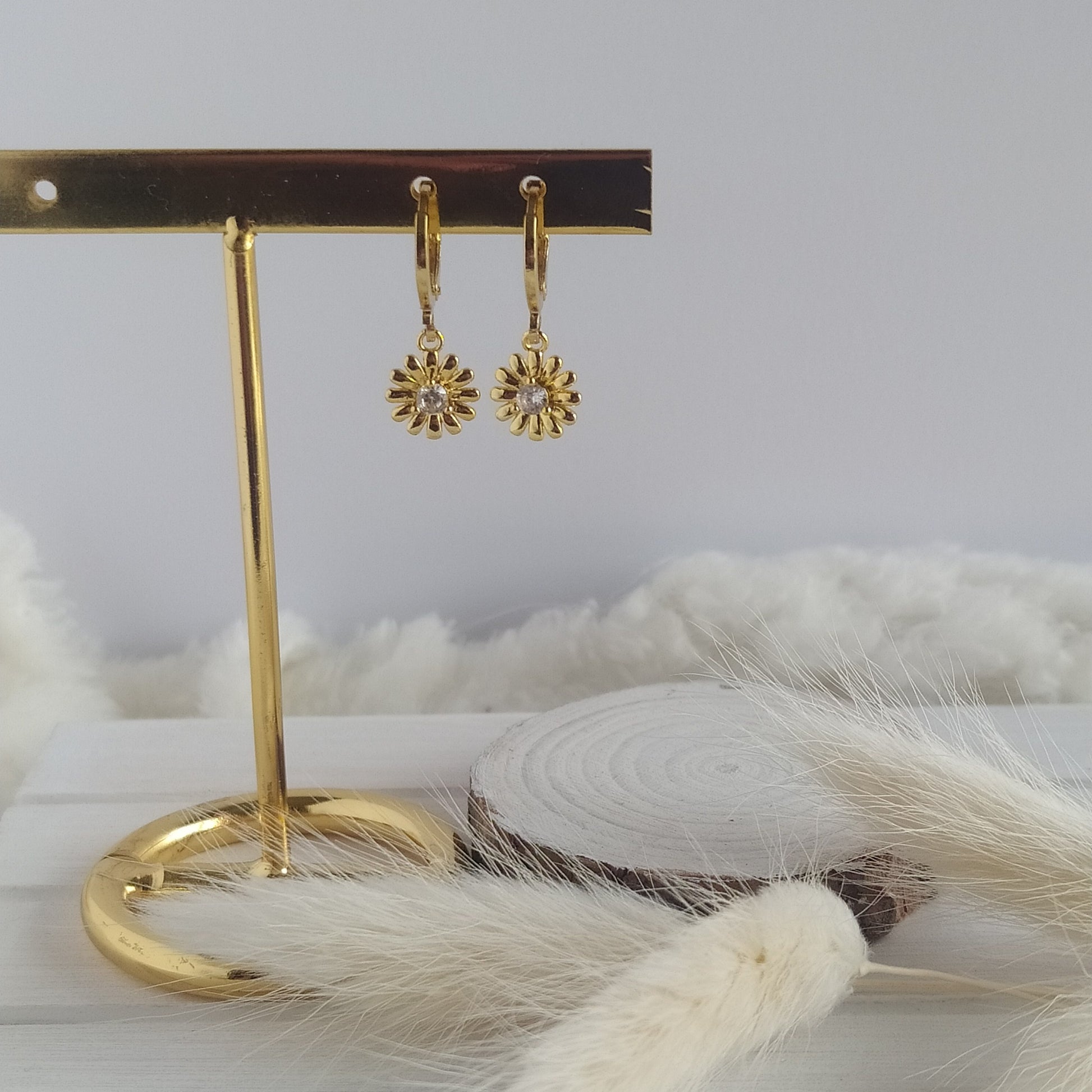 Aro pequeño de 9mm de diámetro de latón bañado en oro con dije en forma de margarita del mismo material con circonita en el medio, montado de forma artesanal. Largo aproximado 2,3cm.