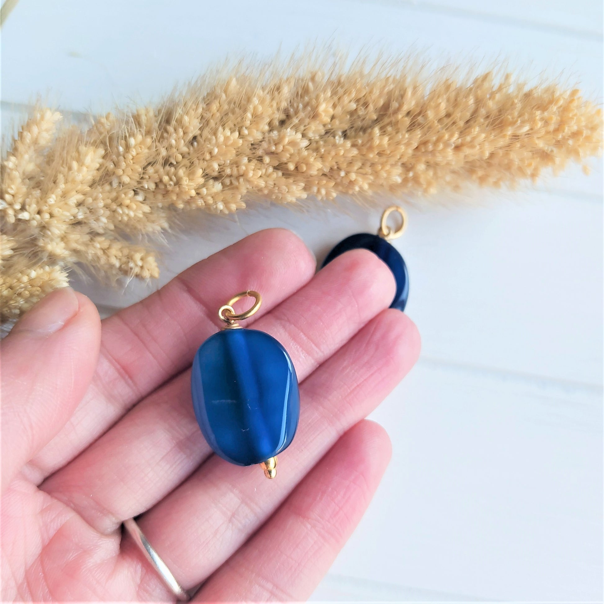 Charm elaborado con una pieza de Ágata azul Egeo irregular y plana de 15x20mm, montada a mano sobre bastón de acero con tope de bola. Trae una anilla de 6mm de diámetro para que puedes pasarlo por la cadena que elijas o colgarlo de unos de los cierres de los collares de cuentas. Puedes tener un solo collar y hacerlo diferente usando uno o varios charms diferentes. Un collar, varios estilos!