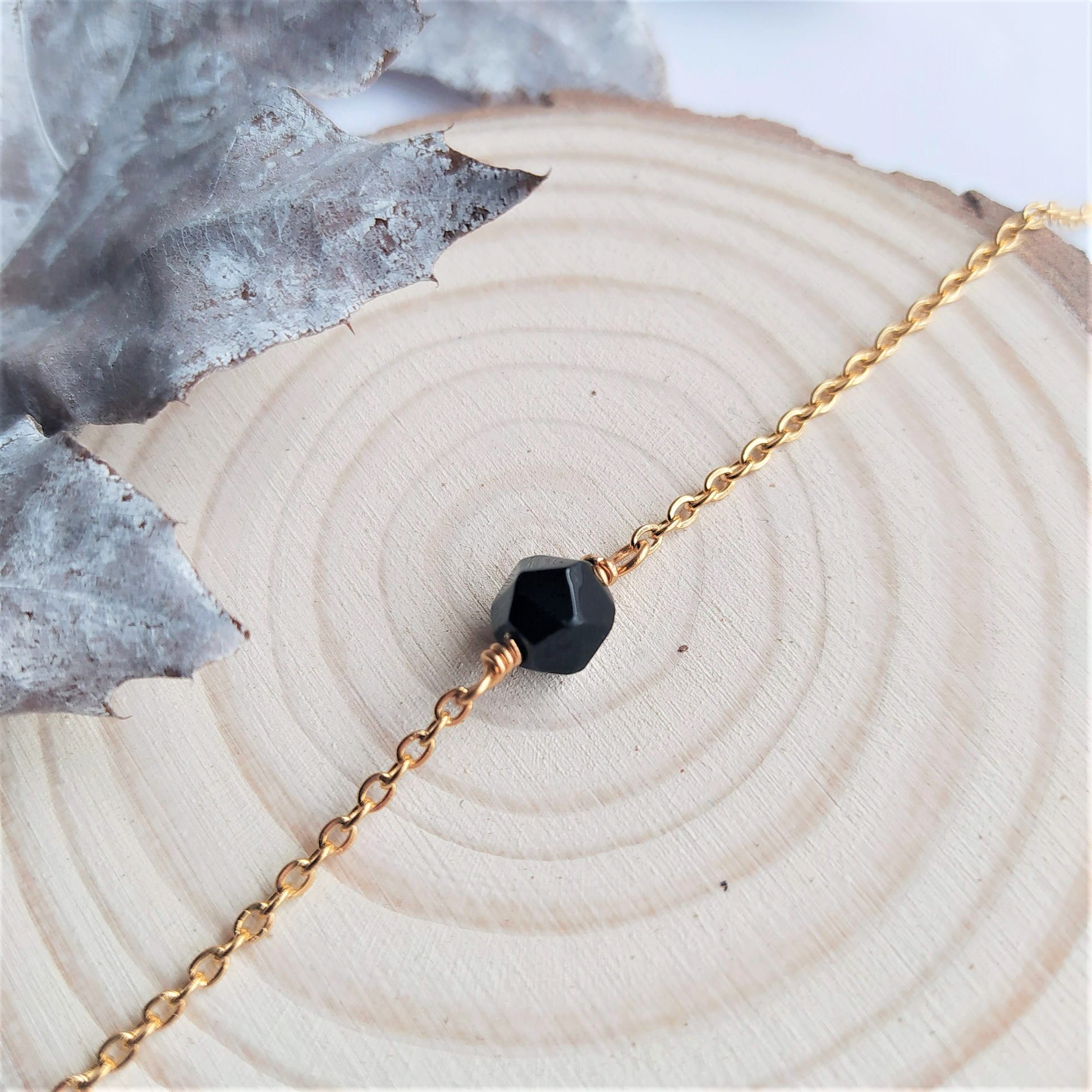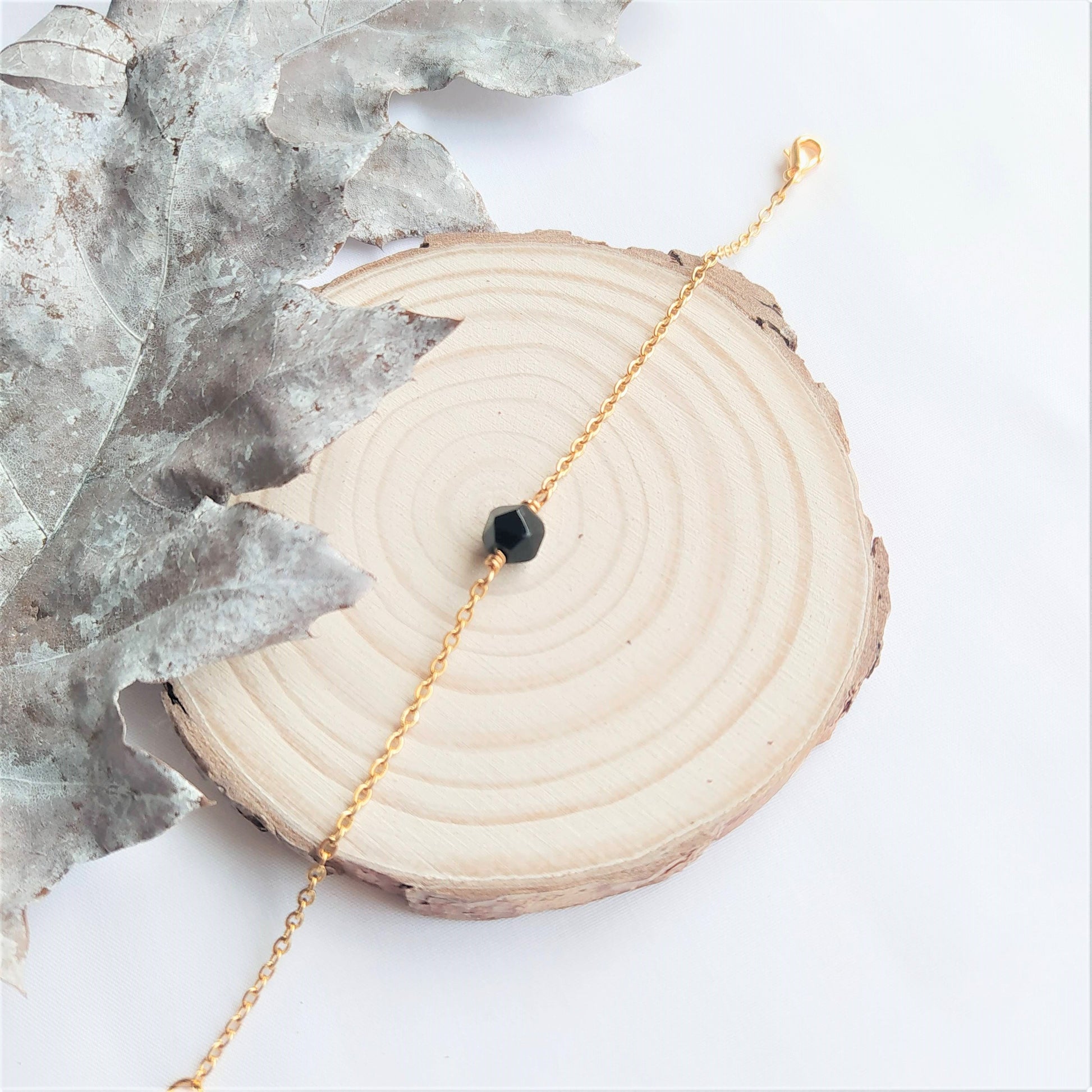 Se trata de una pulsera fabricada con cadena de acero bañado en oro y piedras naturales afines con cada mes de nacimiento.  En este caso lleva una cuenta de Ónix facetada de 8mm. El largo de la pulsera es de 16cm ampliables hasta 21cm.
