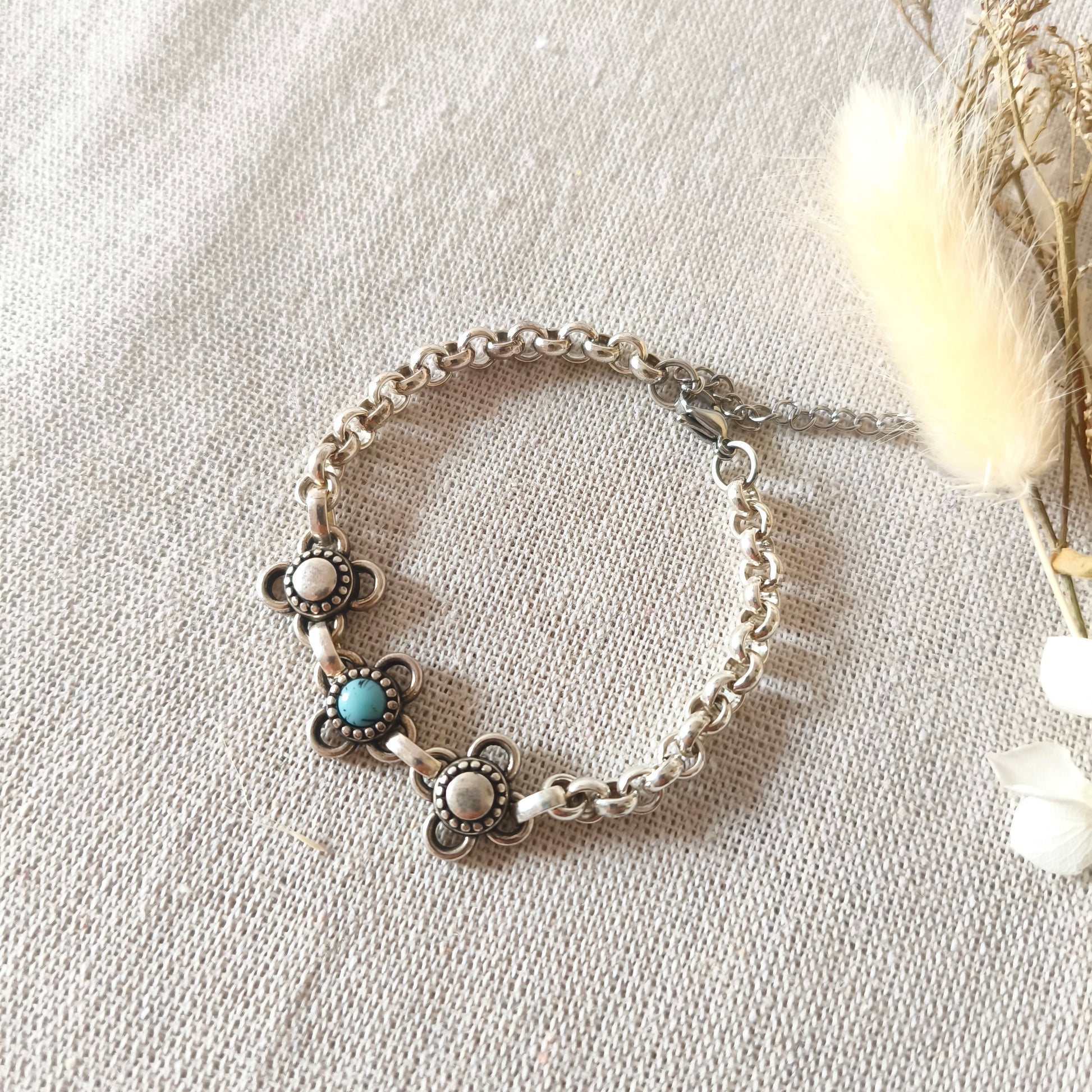 Está fabricada a mano con piezas en forma de flor, 1con Piedra de polvo Turquesa en el centro. Esta piedra se dice que es un potente imán de la buena suerte y la fortuna y una purificadora de la energía. El resto de la pulsera es de cadena de rolo gruesa.
