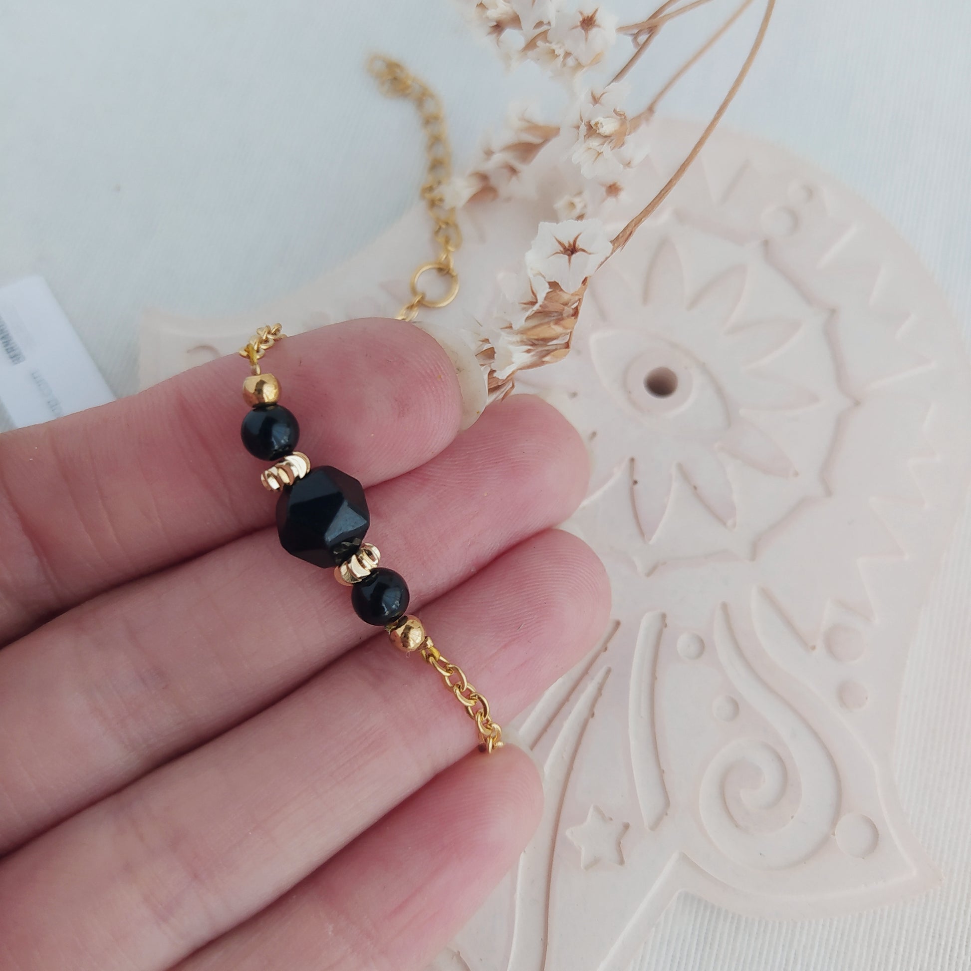 Se trata de una pulsera fabricada con cadena de acero bañado en oro y piedras naturales afines con cada mes de nacimiento.  En este caso lleva una cuenta de Ónix facetada de 8mm, cuenta de Ónix de 4mm, cuentas de acero bañado en oro y cuentas de latón bañado en oro 24k. EL largo de la pulsera es de 16cm ampliables hasta 21cm.