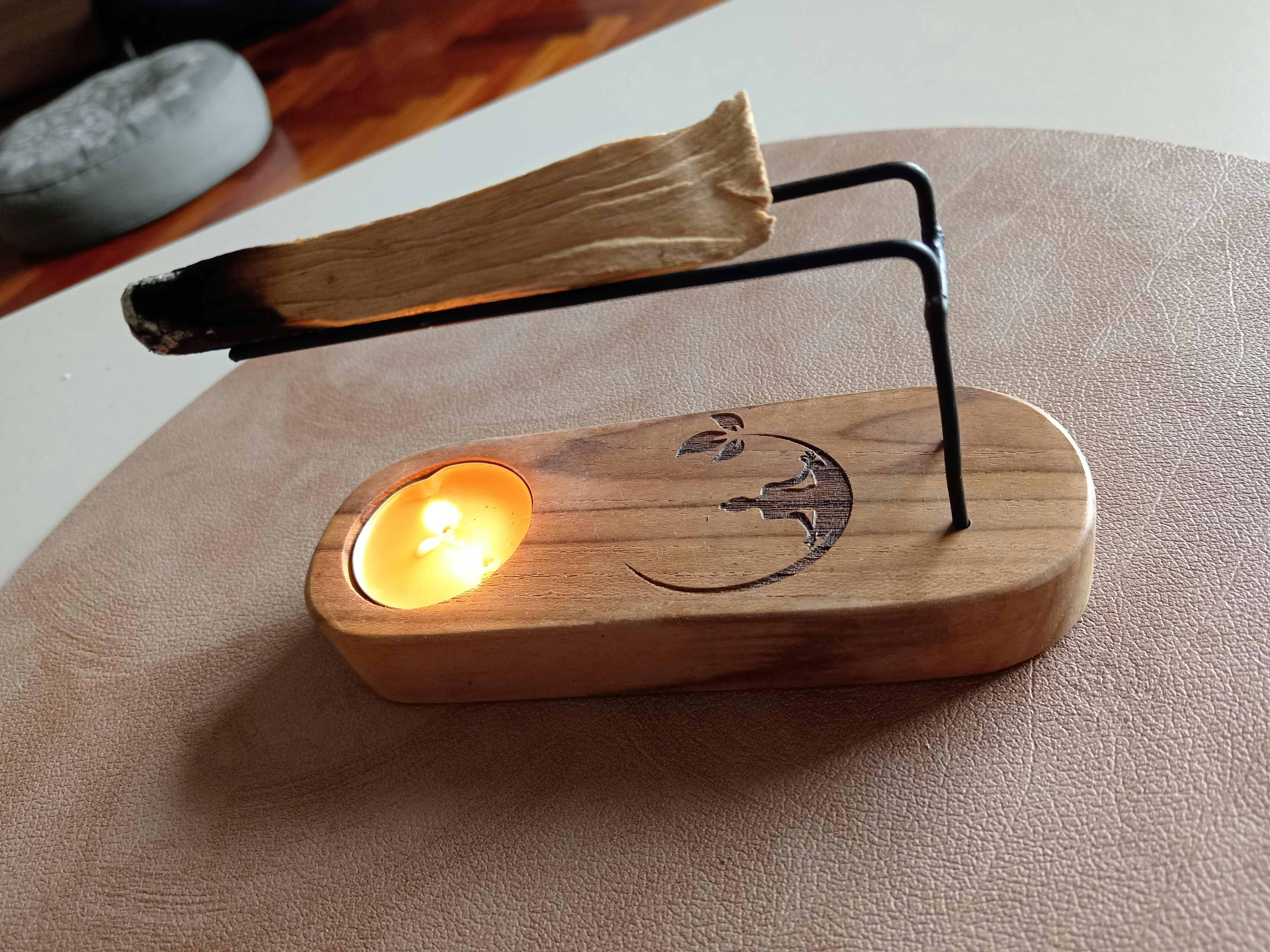 Enciende una vela de té en la base, coloca un bastón de Palo Santo encendido sobre el soporte y disfruta de un sahúmo prolongado.