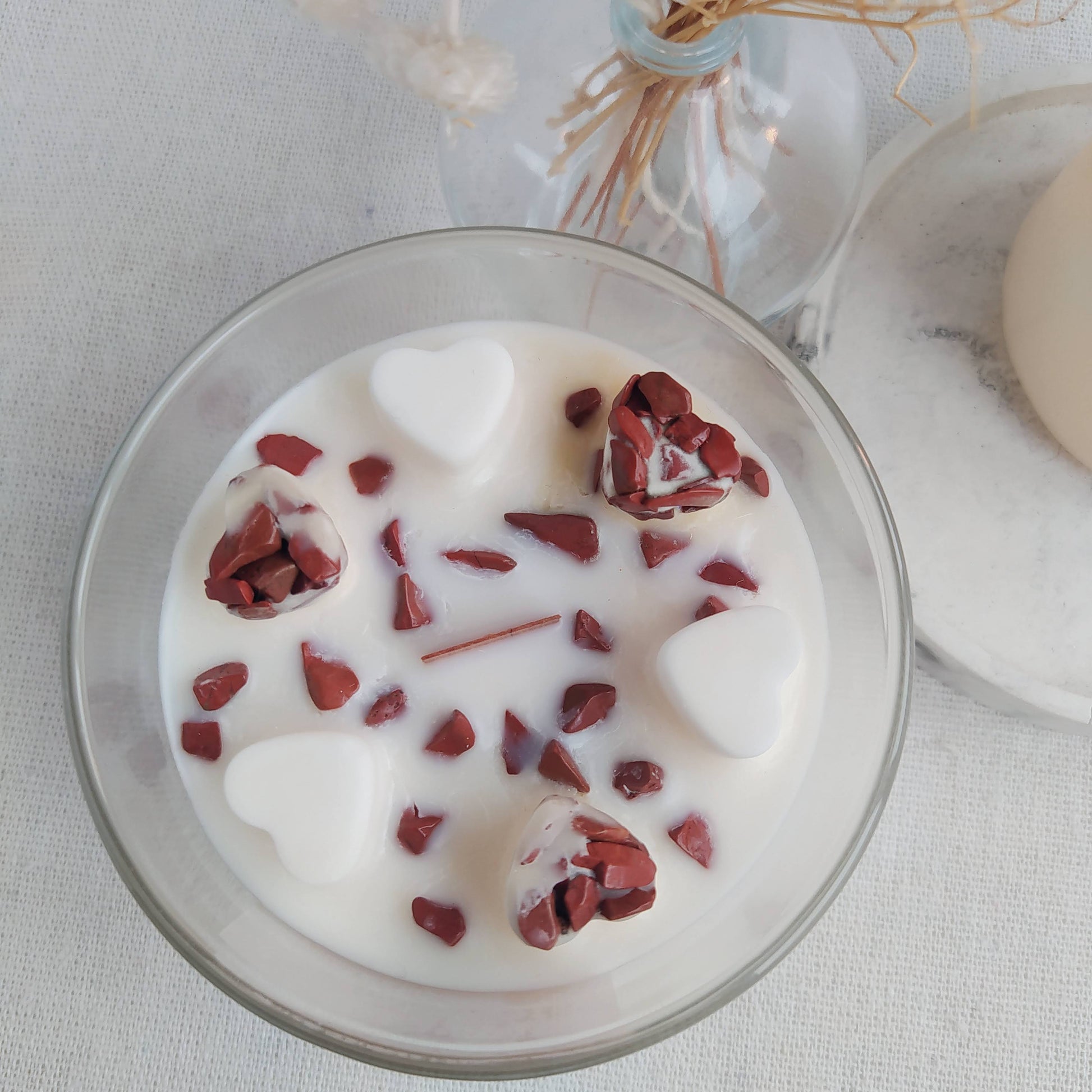La velita Self Love contiene chips de Jaspe rojo,un cristal de enraizamiento que trabaja sobre el equilibrio y el foco, estar centrada en una misma, en conexión con nuestras bondades y objetivos. Está muy relacionada con el amor propio y con aprender a amarse y aceptarse tal y como somos. Está muy relacionado con la motivación.